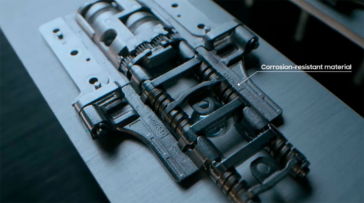 Se aplicó Armor Aluminum a los dos bordes que conforman el exterior y a la carcasa que rodeaba la bisagra. En el interior de la bisagra oculta del Galaxy Z Fold3 se colocaron varios componentes para activar el modo Flex y garantizar una apertura y cierre suaves. Para soportar estas funciones, la carcasa de la bisagra tenía que estar fabricada con materiales resistentes.
