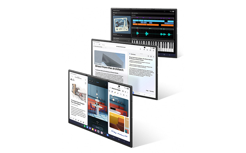 La superficie de 10 pulgadas no se presenta como un simple lienzo expandido. Samsung describe el TriFold como un espacio pensado para ejecutar simultáneamente hasta tres aplicaciones en formato vertical equivalente al de tres teléfonos. Esa disposición recuerda a las estaciones de trabajo ultracompactas y, en la práctica, plantea un giro interesante: el usuario deja de “abrir apps” para organizar zonas de trabajo.
