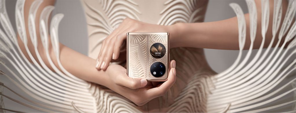 Estableciendo un nuevo estándar para el diseño industrial de los teléfonos inteligentes, Huawei ha unido a la prestigiosa diseñadora de alta costura, Iris Van Herpen, en una colaboración entre industrias para crear HUAWEI P50 Pocket Premium Edition.