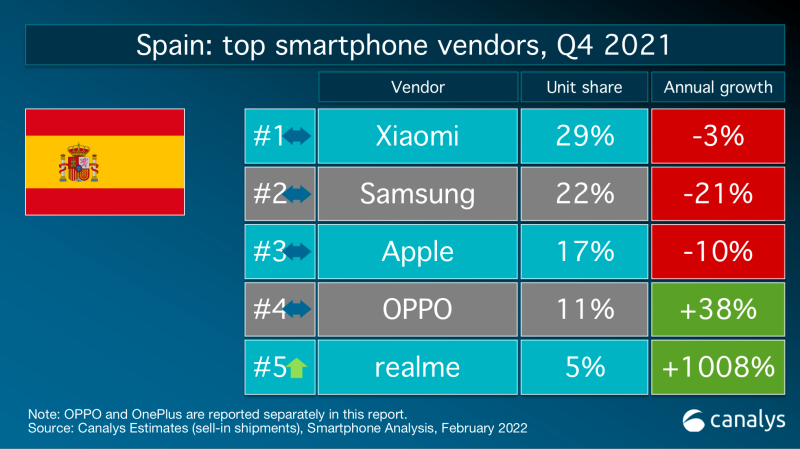 Concretamente en la región de Europa Occidental, el crecimiento registrado ha sido aún mayor, con un incremento del 1365%, llegando a situarse en el Top 5 en Alemania, Italia, España, Países Bajos y Bélgica. En nuestro país, el crecimiento anual de realme ha alcanzado un 1008%, lo que le ha permitido entrar dentro del ranking de las cinco primeras marcas de smartphones en España, alcanzando una cuota de mercado del 5%.