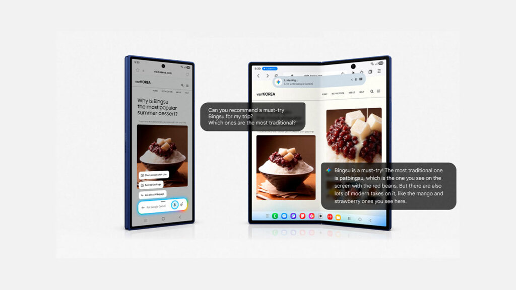 El Galaxy Z Fold7 aprovecha la pantalla interna de 8 pulgadas para mejorar la productividad mediante funciones de multitarea con IA. Con Gemini Live mejorado, los usuarios pueden interactuar por voz o texto y obtener respuestas contextuales sin cambiar de aplicación. Además, permite compartir la pantalla o la cámara para realizar consultas visuales directamente desde la interfaz.