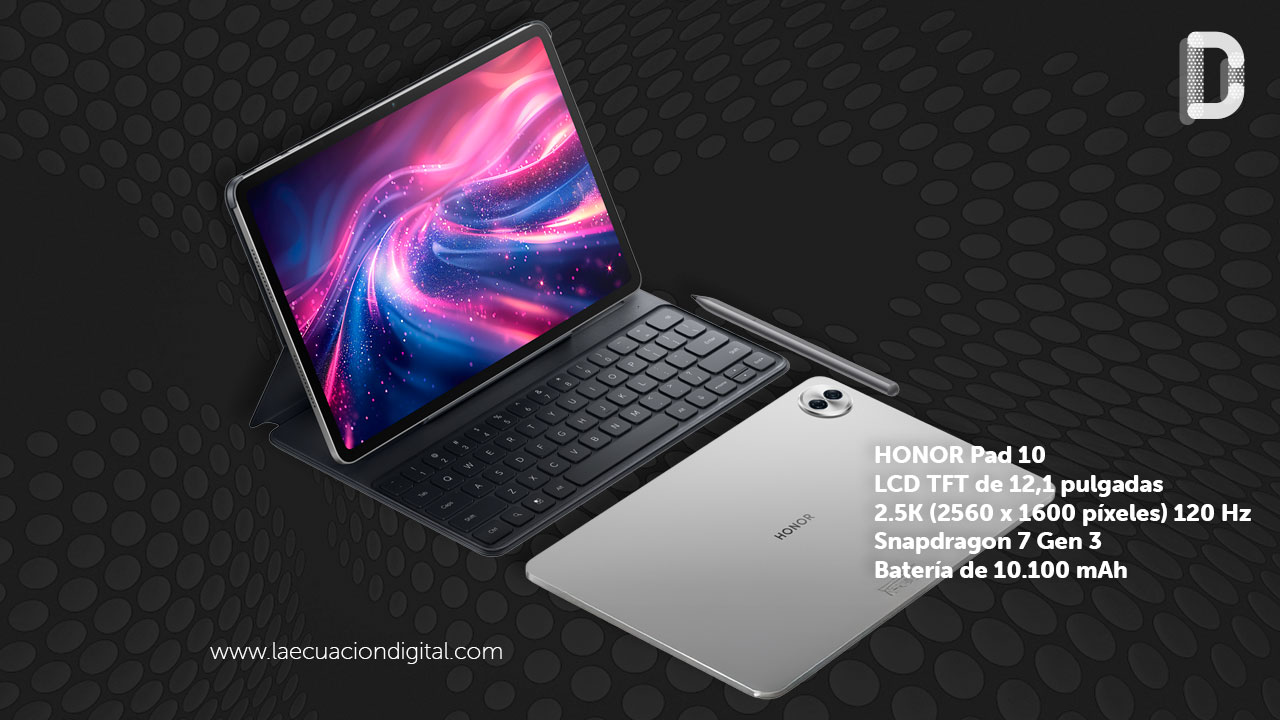 La HONOR Pad 10 integra una pantalla LCD TFT de 12,1 pulgadas con resolución 2.5K (2560 x 1600 píxeles) y una tasa de refresco de hasta 120 Hz. Según la información facilitada por la compañía, el panel cubre el 96% del espectro de color NTSC, alcanza un brillo máximo de 500 nits y admite hasta 1.070 millones de colores. Esta pantalla forma parte de la tecnología propietaria HONOR Eye Comfort, enfocada en reducir la fatiga ocular durante el uso prolongado.