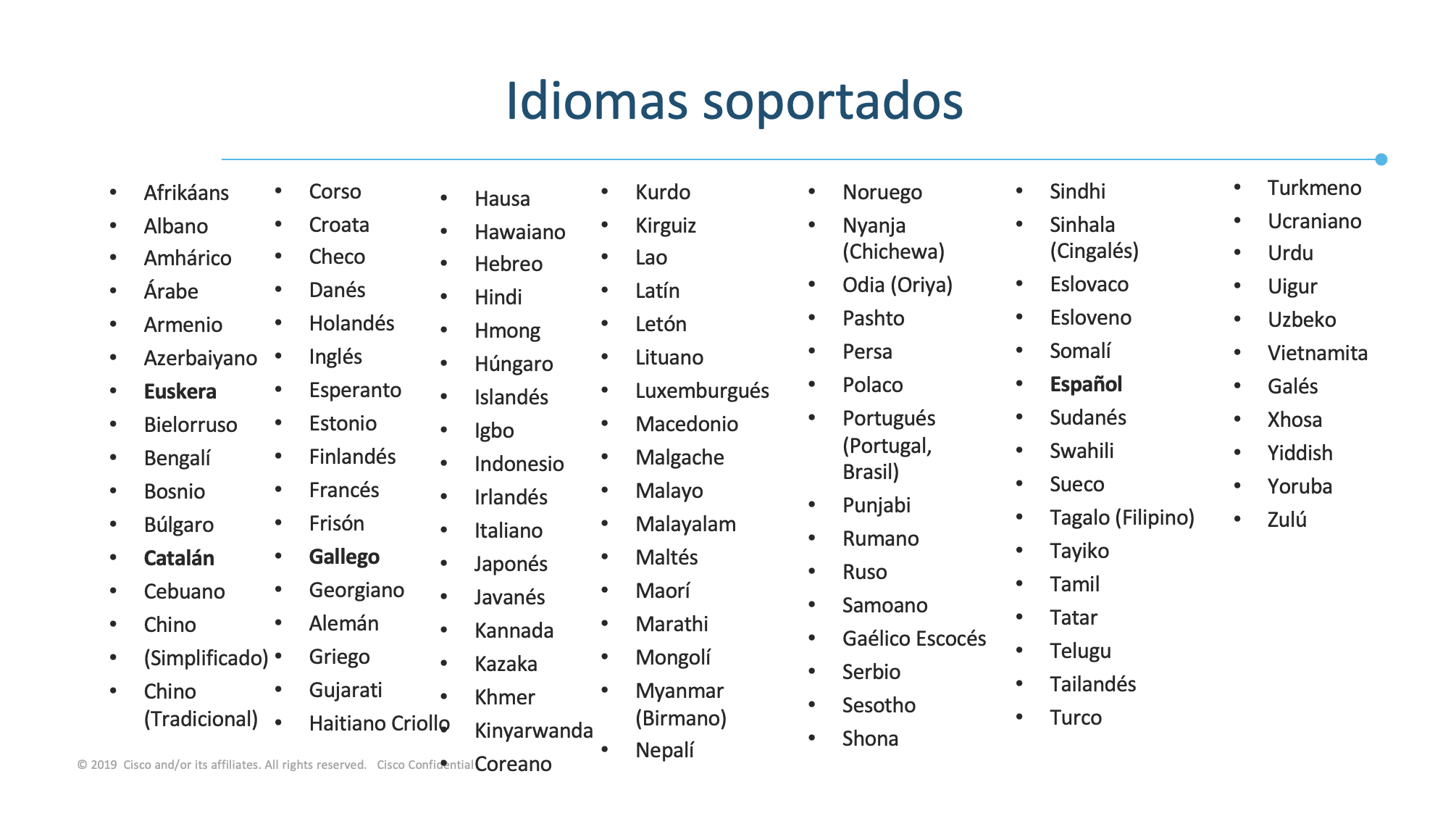 Eliminar barreras lingüísticas es clave para lograr una fuerza de trabajo verdaderamente global e híbrida. Cisco Webex ha ampliado su funcionalidad de traducción en tiempo real, en modo preview a partir de este mes y con disponibilidad generalizada en mayo. Mediante Inteligencia Artificial (IA), la funcionalidad incluye traducción de inglés a más de 100 idiomas (incluyendo español, catalán, euskera y gallego) -desde los 10 anteriores-, y está prevista su ampliación a nuevos idiomas tanto de origen como de destino durante 2021.