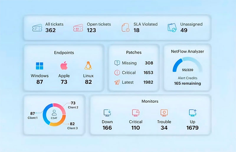 La plataforma admite multi-tenencia nativa, lo que permite a los MSP operar con distintos clientes de forma simultánea y segura, y está preparada para integrarse con más de 20 herramientas de terceros a través de API abiertas y conectores preconstruidos.