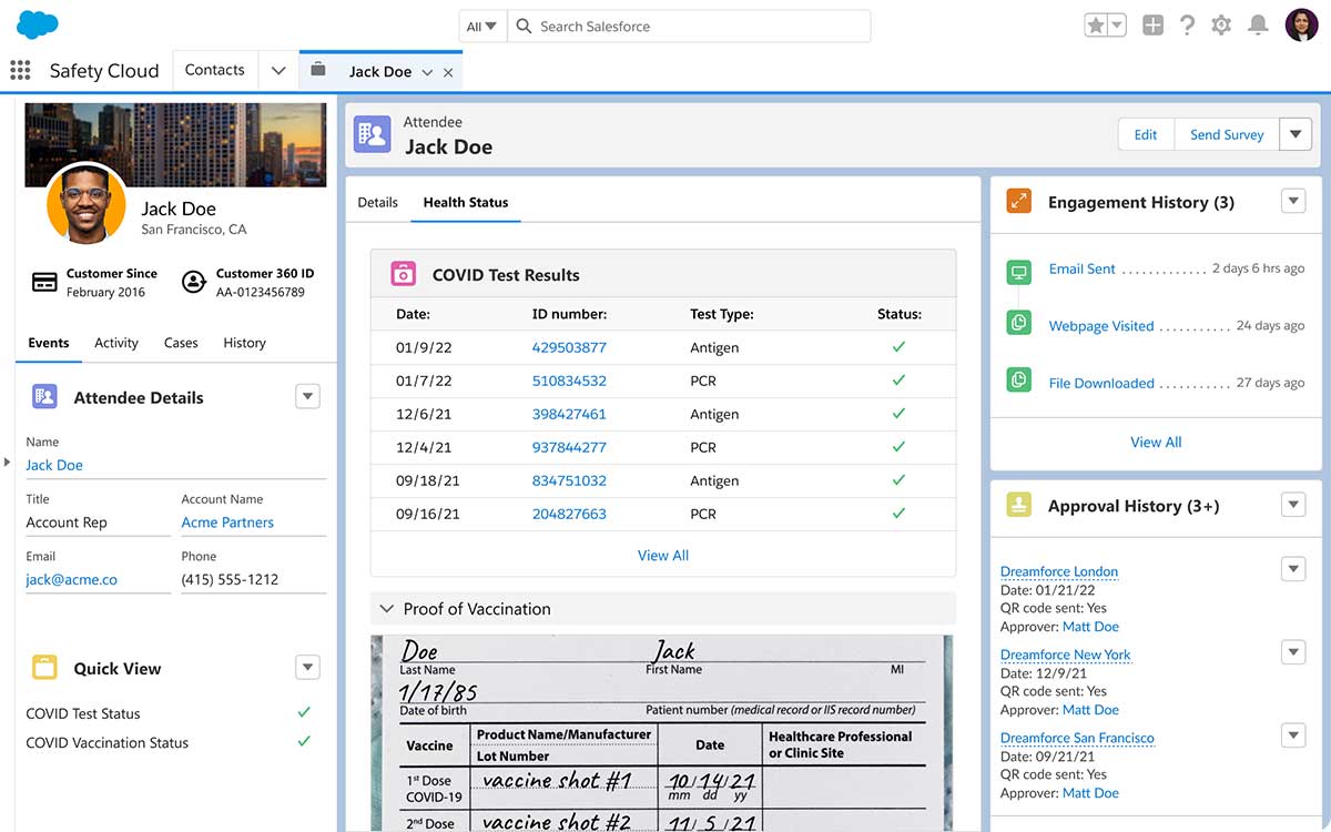 Basándose en la propia experiencia de Salesforce en eventos y lugares de trabajo -y ampliando las innovaciones existentes en materia de salud y seguridad anunciadas en diciembre-, Safety Cloud ayuda a las empresas y comunidades a gestionar mejor sus pruebas y protocolos de salud, al tiempo que automatiza y simplifica la entrada segura a eventos y lugares de trabajo.
