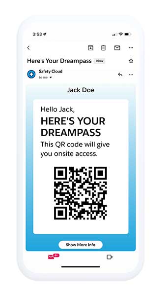 • Automatizar la entrada al lugar de trabajo y combinar la identificación y el estado de salud en un Dreampass (un pase multifactorial seguro para un acceso validado). Por ejemplo, un equipo de RRHH que quiere que sus empleados vuelvan al lugar de trabajo de forma segura, puede automatizar la entrada a un edificio con un pase digital una vez que se detecta un resultado negativo de la prueba de COVID-19.