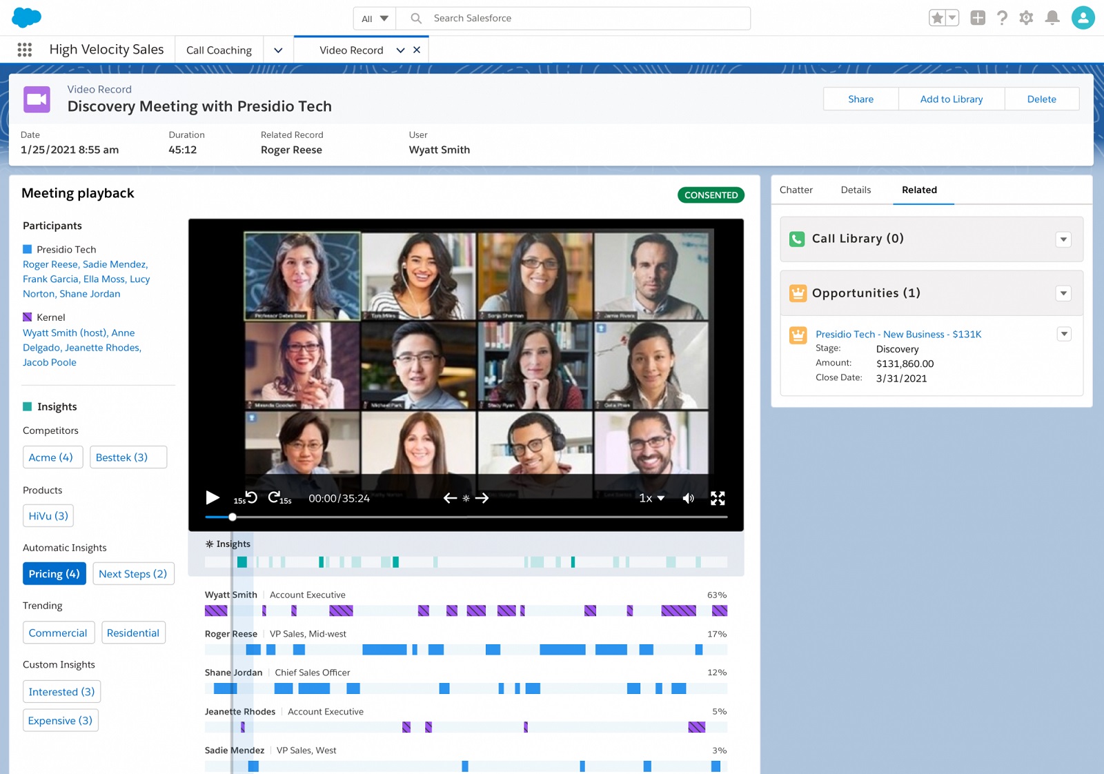 - Salesforce Meetings ya está disponible de forma general y hace que las conversaciones virtuales sean más atractivas. Antes de una reunión, los vendedores tienen una vista de 360º de todos los asistentes en una sola pantalla, incluyendo el historial de cuentas, los casos de servicio abiertos y las biografías. Una vez iniciada la reunión, tanto la presentación como el presentador se muestran juntos para lograr una conexión más atractiva y humana. Después de la llamada, los elementos de acción automatizados indican al comercial que programe una reunión de seguimiento o cree un contacto para un nuevo responsable de la toma de decisiones.
