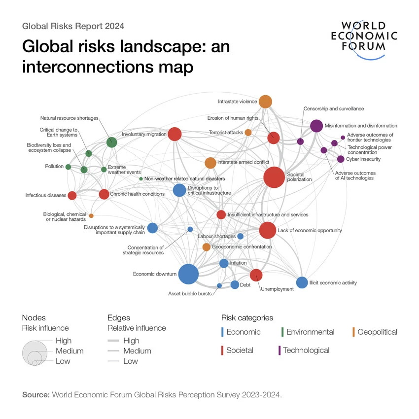 En su Informe de Riesgos Globales 2024, basado en casi dos décadas de datos originales sobre la percepción de los riesgos, el Foro Económico Mundial advierte: nos encontramos ante un panorama global de riesgos en el que el desarrollo humano comienza a estancarse, y los Estados y la población quedan, por tanto, en una posición vulnerable frente a riesgos nuevos y ya conocidos.