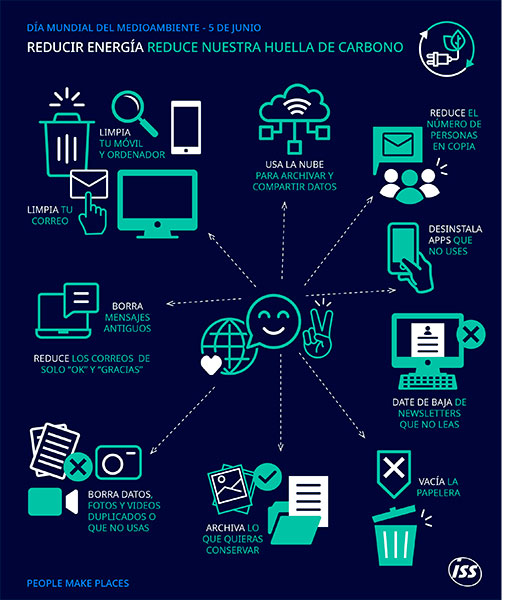 La transformación digital ha traído muchos beneficios, como la reducción del consumo de papel, que repercuten positivamente en la lucha contra el cambio climático y reducen las emisiones de CO₂. “Sin embargo, la producción, el uso y la transferencia de datos y, sobre todo, el almacenamiento provoca más emisiones de CO₂ de lo que cabría esperar”, explica Ana Jimeno, Gerente de Calidad, Medio Ambiente y Prevención de Riesgos Laborales de ISS España, empresa líder en workplace. Estas emisiones se resumen bajo el término huella de carbono digital.
