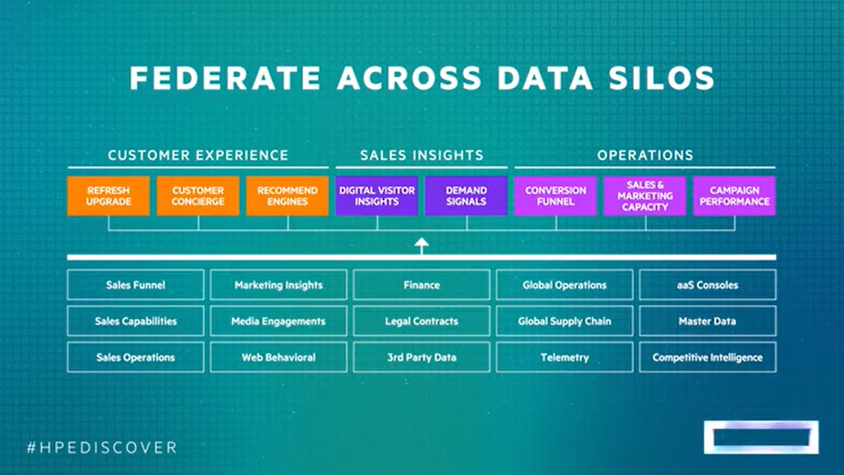 Según Lim Goh estamos saturados de datos pero todos estos datos están en silos lo que dificultad su uso por parte de toda la organización. HPE propone una federación de silos de datos con una capa de aplicaciones que utilizan estos datos de forma integrada y de fuentes dispares.