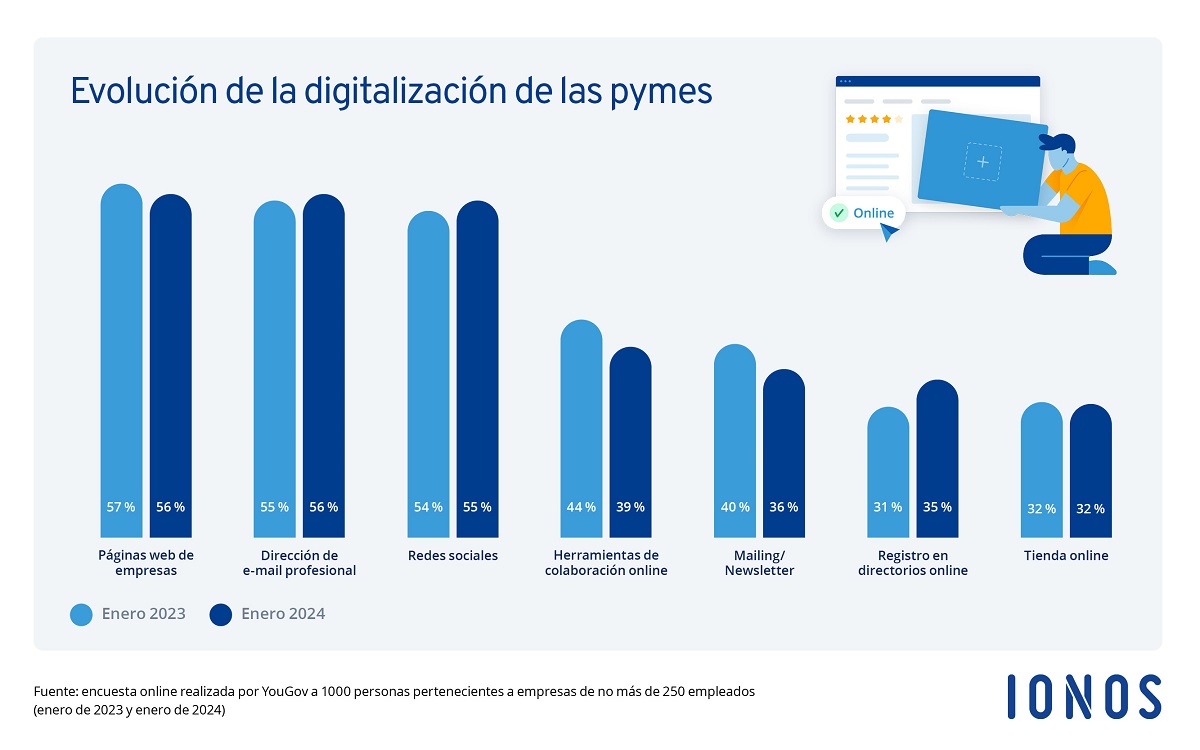 La digitalización sigue siendo un elemento clave para las pequeñas y medianas empresas de España, incluso para las más pequeñas, que continúan apostando por digitalizarse para modernizar su imagen, mejorar sus ingresos y ganar en visibilidad en Internet. El estudio de 2024 de IONOS contó con la participación de más de 1.000 encuestados en nuestro país, de empresas de hasta 250 empleados, posicionando un año más la digitalización como un factor muy relevante para el éxito de este tipo de empresas.