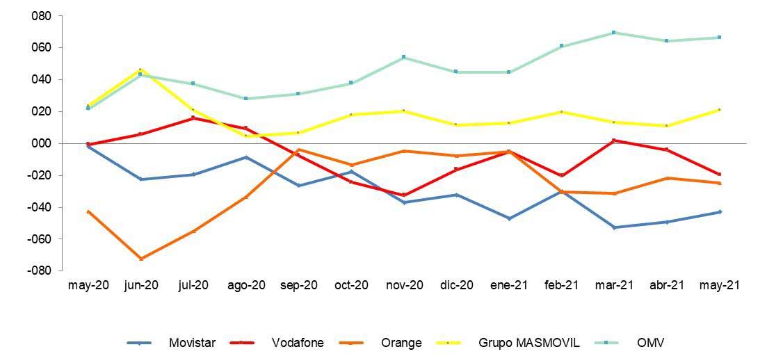En mayo se portaron 546.796 números móviles. Grupo MASMOVIL y los OMV registraron saldos netos de portabilidad positivos, mientras que Vodafone, Orange y Movistar presentaron saldos negativos.
