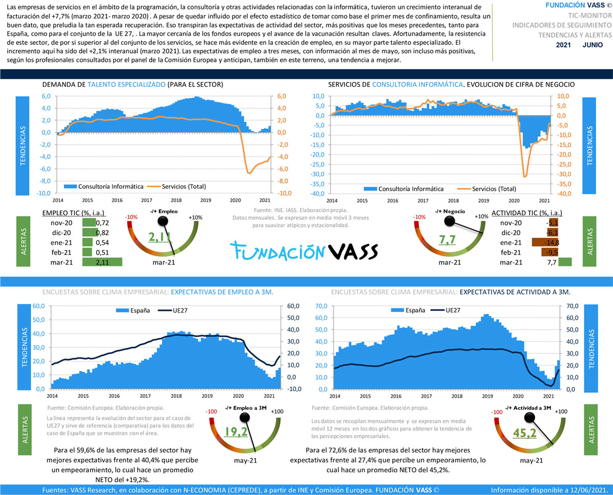 Según la última entrega del barómetro mensual TIC Monitor, elaborado conjuntamente por VASS y el Centro de Predicción Económica CEPREDE, este magnífico dato marca el ansiado camino de la recuperación en la que el sector de servicios TIC se erige como uno de los principales motores.
