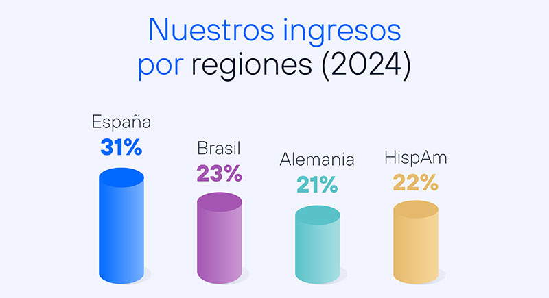 En términos de ingresos anuales, Telefónica España ha alcanzado los 12.791 millones de euros (+1,1%), Brasil ha crecido hasta los 9.618 millones de euros y Alemania ha registrado 8.492 millones de euros (+4,3%). Además, los negocios globales han mantenido una evolución favorable, con Telefónica Tech creciendo un 10%, hasta los 2.065 millones de euros, y Telefónica Infra cerrando el ejercicio con 25 millones de unidades inmobiliarias pasadas con FTTH.