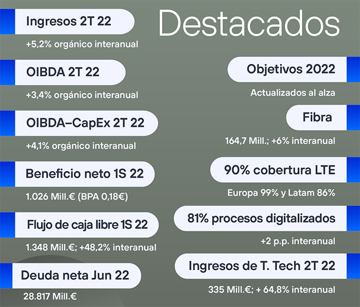 Telefónica ha obtenido unos sólidos resultados en la primera mitad de 2022 en un contexto marcado por una elevada incertidumbre en los mercados globales. En el segundo trimestre, la compañía ha acelerado el crecimiento de los ingresos y del resultado operativo antes de amortizaciones (OIBDA), nuevamente con un incremento de las ventas en todos los mercados de la operadora, tanto en términos orgánicos como reportados.