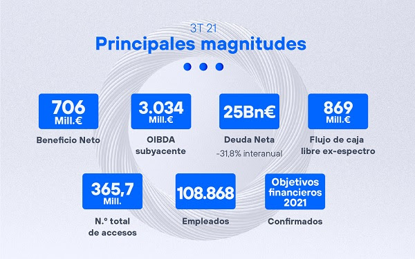 Entre julio y septiembre, y por segundo trimestre consecutivo, tanto los ingresos como el OIBDA han crecido en términos orgánicos un 3,6% y un 1,6%, respectivamente, mientras que en los nueve primeros meses el crecimiento de ambas magnitudes ha sido del 1,7%. Estas dos referencias evolucionan así hacia el cumplimiento de los objetivos establecidos para 2021.
