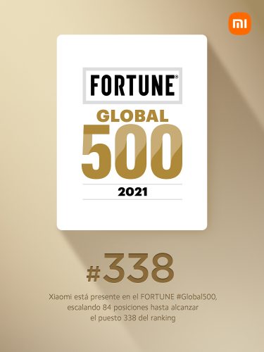 Xiaomi ha sido incluida en la lista Fortune Global 500 por tercer año consecutivo, ascendiendo a la posición 338 (lo que representa un avance de 84 puestos respecto a 2020). Esta clasificación sitúa a Xiaomi como la empresa con mayor crecimiento en la categoría de Internet y Retail de la lista Fortune Global 500 en 2021.
