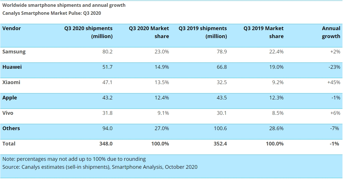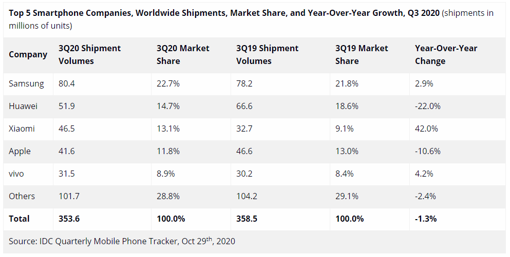 Durante este periodo, Xiaomi ha alcanzado una cuota de mercado global equivalente al 13 % (respecto al 8 % que lograba en el mismo periodo de 2019). De esta forma, la compañía ha registrado un crecimiento interanual superior al 40 % (concretamente, un 42 %, según IDC; un 45 %, según Canalys, y un 46 %, según Counterpoint, que también apunta un crecimiento trimestral [QoQ] del 75 %).