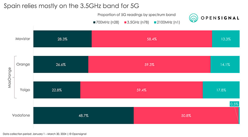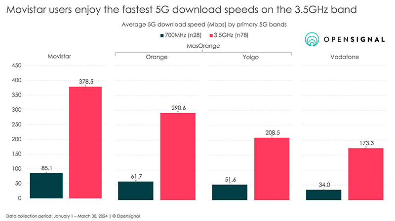 Le siguen Orange, Yoigo y Vodafone, con velocidades menores. Movistar también lidera en las velocidades de la banda de 700MHz, utilizada principalmente para mejorar la cobertura en áreas rurales y interiores de edificios. Vodafone, en comparación, muestra las velocidades más bajas en ambas bandas.