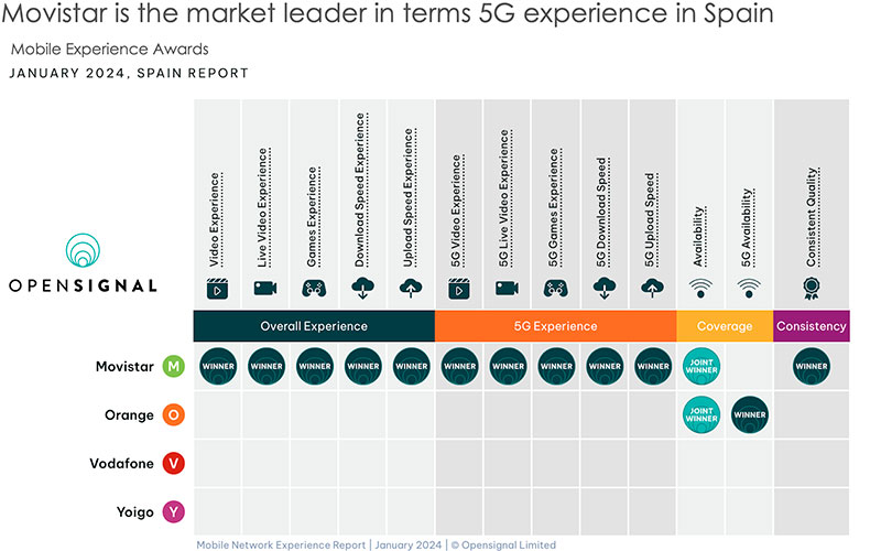 El análisis de OpenSignal destaca a Movistar como un competidor clave en el mercado 5G español. Movistar ha liderado en términos de velocidad de descarga en la banda de 3.5GHz, alcanzando aproximadamente 380Mbps, superando a Orange, Yoigo y Vodafone. Además, Movistar también ha demostrado un desempeño superior en la banda de 700MHz, utilizada principalmente para mejorar la cobertura en áreas rurales y en interiores de edificios.