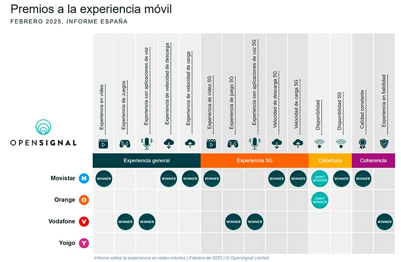 Movistar es el operador más reconocido en este informe, acumulando ocho premios directos y uno conjunto. Vodafone le sigue en el ranking con cinco galardones, destacando en fiabilidad, juegos móviles y aplicaciones de voz. Orange y Yoigo, en comparación, han tenido un desempeño más discreto en esta evaluación.