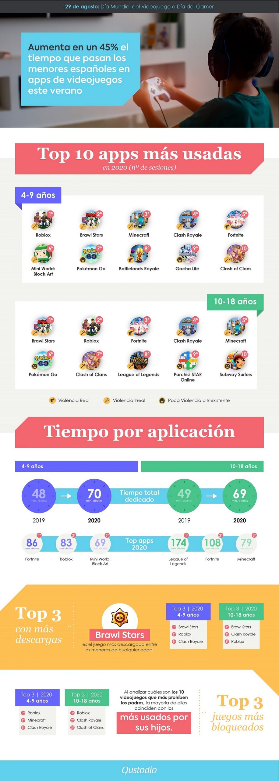 En el Top 10 con los juegos más utilizados entre los menores españoles (por número de sesiones), al igual que ya sucedía el año pasado, Roblox, Brawl Stars y Minecraft ocupan los primeros puestos del ranking entre los pequeños de 4 a 9 años. En el caso de los menores de 10 a 18 años, la lista se mantiene salvo en el caso de Minecraft, que es sustituido por Fortnite. Aquí se observan mayores diferencias con 2019, donde los más utilizados fueron: Brawl Stars, Fortnite y Clash Royale.