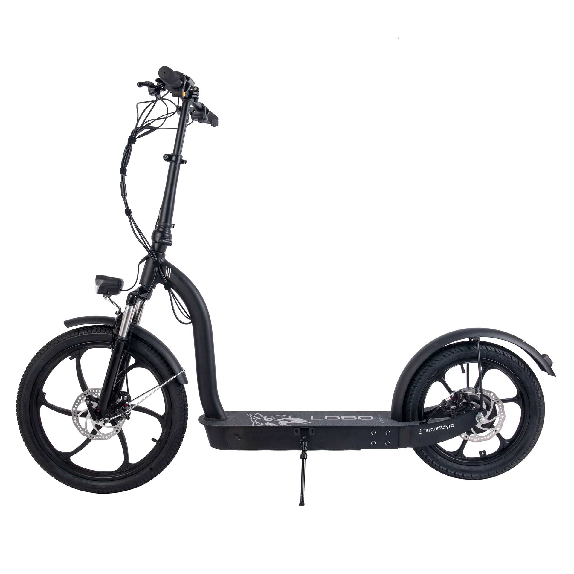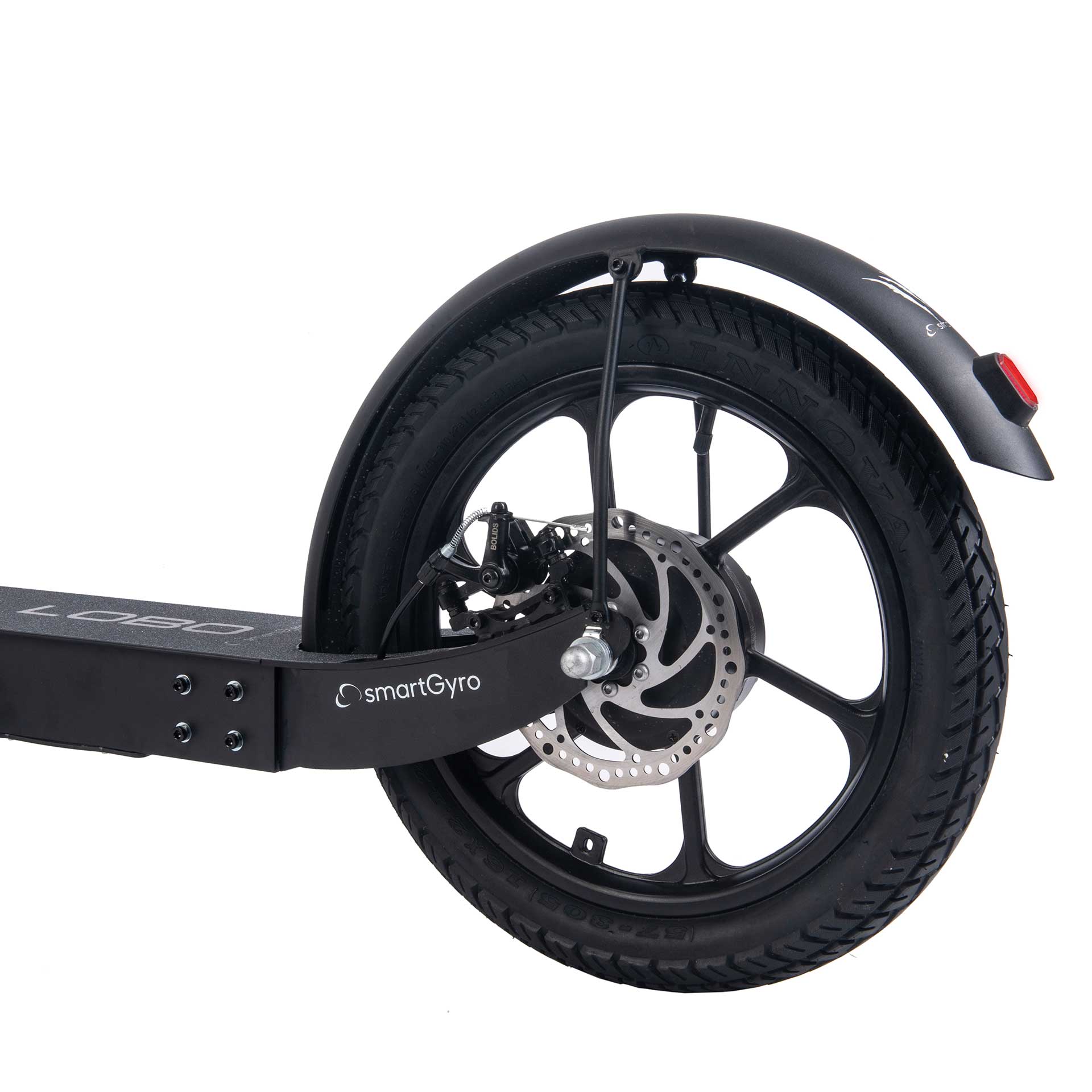 smartGyro Lobo es un patinete eléctrico de 500W de potencia, proporcionados por su motor de transmisión directa de tres velocidades. Las particularidades de su atractivo diseño están pensadas para mejorar la maniobrabilidad y la ergonomía, convirtiéndolo en un vehículo cómodo y seguro. Está fabricado en materiales muy resistentes que conforman una estructura amplia. Su rigidez, su diseño y sus ruedas de 20 y 16 pulgadas hacen que se mueva perfectamente por todo tipo de terrenos, ya sean asfaltados o bacheados, sin apenas inmutarse. A ello contribuyen también su potente sistema de frenado por discos y la suspensión de horquilla delantera.