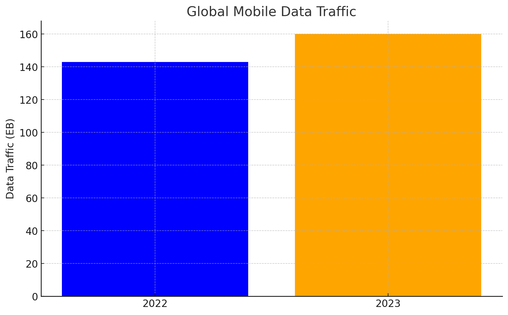 En términos de tráfico de datos, el crecimiento del tráfico de la red móvil entre el tercer trimestre de 2022 y 2023 fue de aproximadamente un 7%, con un tráfico mensual global de datos móviles alcanzando 143 EB. Se espera que el tráfico global de datos móviles, excluyendo el acceso inalámbrico fijo (FWA), alcance los 130 EB mensuales a finales de 2023, proyectándose un crecimiento hasta 403 EB mensuales para 2029. La proyección incluye la suposición de que habrá una adopción inicial de servicios de realidad extendida (XR) hacia el final del período pronosticado.