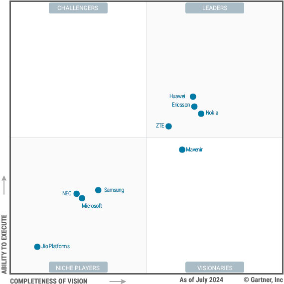 Microsoft y NEC se posicionan en el cuadrante de jugadores de nicho, con enfoques especializados en la integración de infraestructuras en la nube y en el despliegue de redes Open RAN, respectivamente. Mavenir, en cambio, destaca como un visionario, con su propuesta flexible y nativa de la nube, aunque con alcance limitado fuera de Europa y América del Norte.