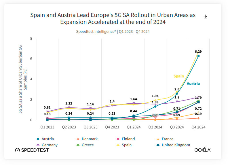 - España y Austria: A la cabeza en cobertura rural de 5G SA, impulsadas por el uso del espectro de 700 MHz.