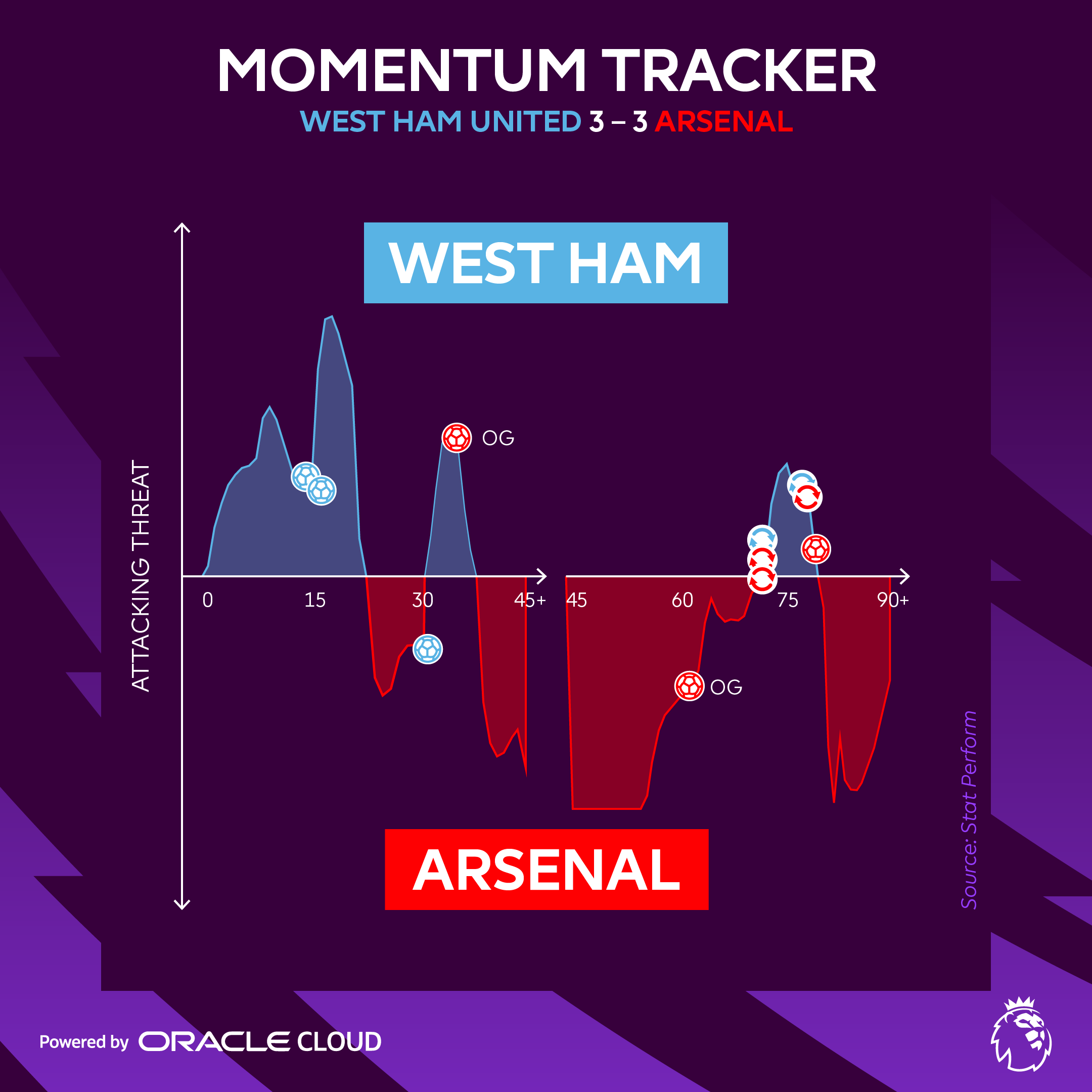 - Rastreador Momentum: Esto mide la probabilidad de que el equipo en posesión marque un gol en los próximos 10 segundos. Los resultados se basan en datos de miles de juegos históricos y los últimos cinco eventos en posesión actual. El modelo incorpora los resultados de pases, regates en posesión, tackles y los lugares en el terreno de juego donde se llevan a cabo.