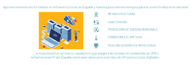 • Se aprovechará el liderazgo en conectividad fija y móvil y las fortalezas energéticas y geográficas para convertir a España en un centro clave de conectividad del Sur de Europa.