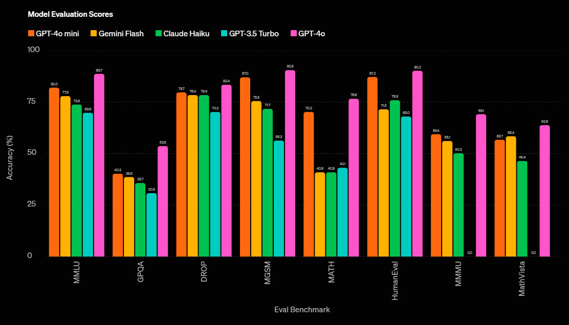 OpenAI no ha revelado el tamaño exacto de los parámetros de GPT-4o mini, pero se especula que podría ser similar al Claude 3 Haiku de Anthropic y al Gemini 1.5 Flash de Google. La empresa afirma que GPT-4o mini ofrece un rendimiento superior en pruebas de referencia comparado con modelos similares.