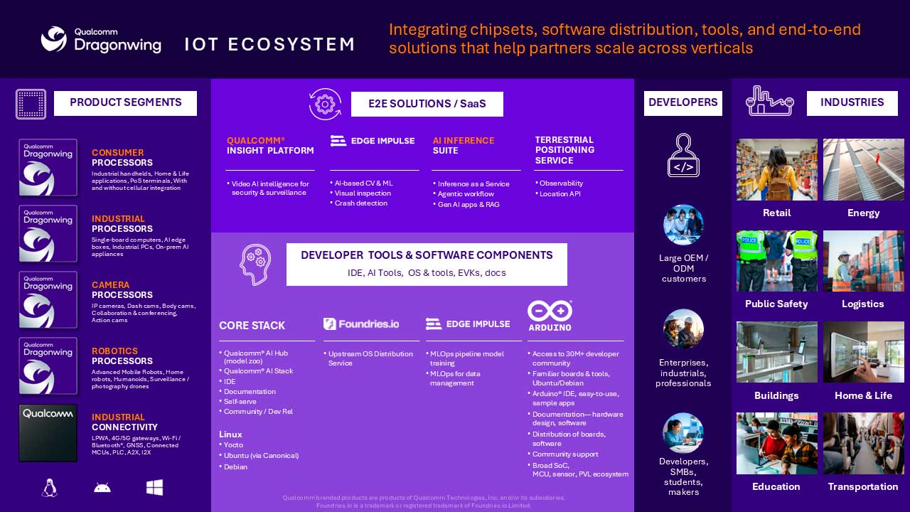 Qualcomm presenta esta suma de activos como una arquitectura unificada, con soporte para Linux, Windows y Android, y con líneas de producto diferenciadas pero coherentes entre sí. La ambición es clara: reducir la fragmentación que históricamente ha frenado la adopción del edge AI, donde cada proyecto exigía combinaciones casi artesanales de hardware, firmware y herramientas.
