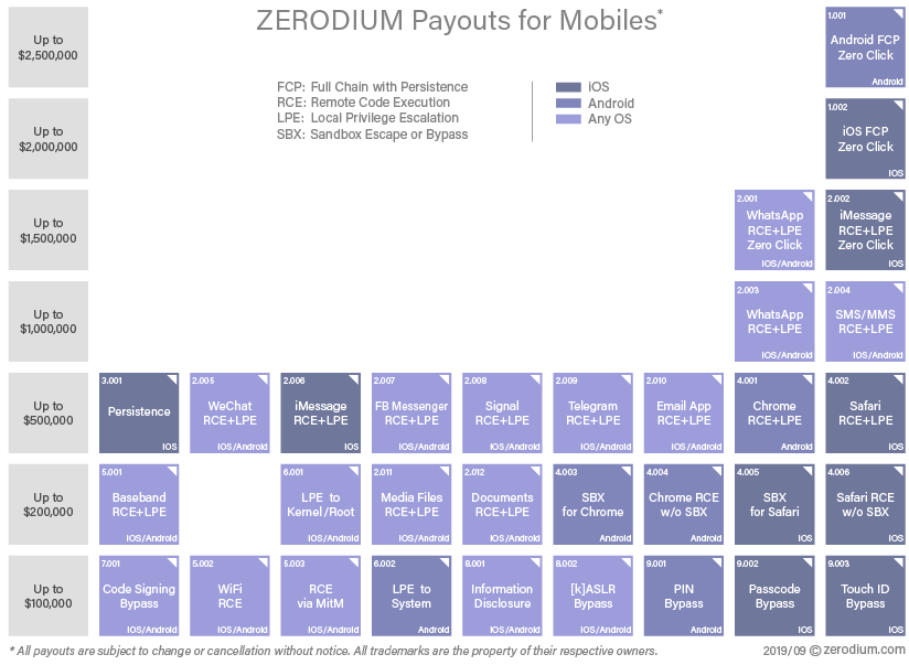 En la imagen sobre estas líneas observamos cómo la empresa Zerodium (una de las más reconocidas en el mercado de compra de vulnerabilidades) paga hasta US$2,5 millones por una vulnerabilidad en Android que comprometa y consiga persistencia en el dispositivo, sin que el usuario tenga que intervenir, mientras que por el mismo tipo de vulnerabilidad en iOS se pagan hasta US$2 millones.