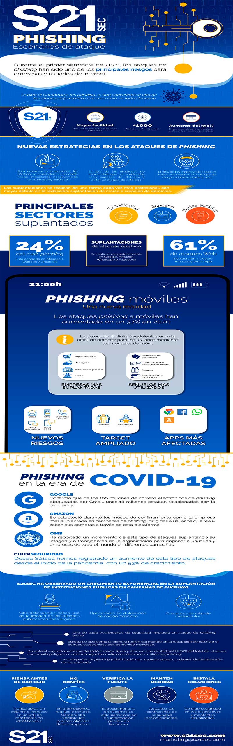 Según el equipo de Inteligencia de S21sec, los riesgos del phishing no se reducen al correo electrónico; la suplantación de identidad también se despliega mediante mensajes de texto, llamadas de voz, aplicaciones de mensajería y plataformas de redes sociales, afectando a su vez a trabajadores que, con la extensión del teletrabajo como fórmula laboral, hacen uso de dispositivos personales para su actividad.