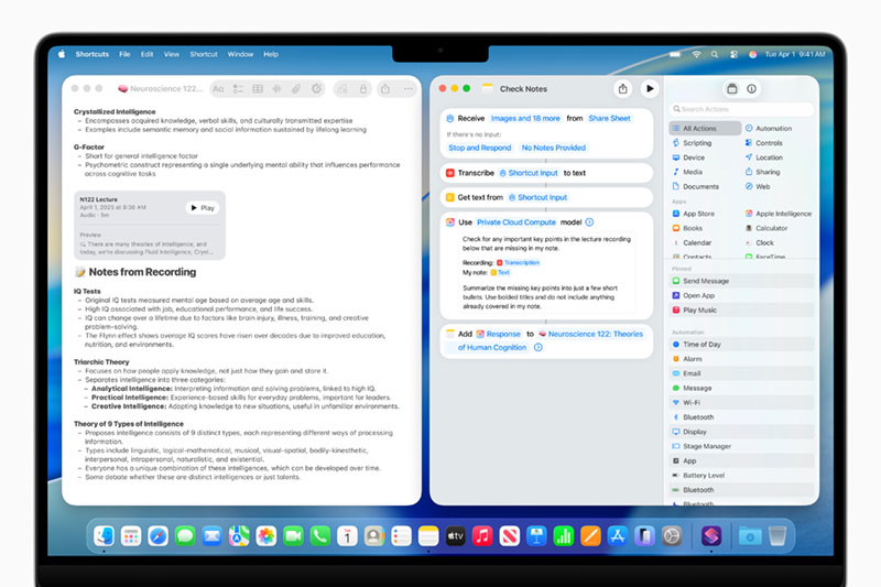 Entre los usos potenciales, Apple menciona la posibilidad de crear un atajo que compare la transcripción de una clase con los apuntes de un estudiante para identificar información omitida y complementarla automáticamente.
