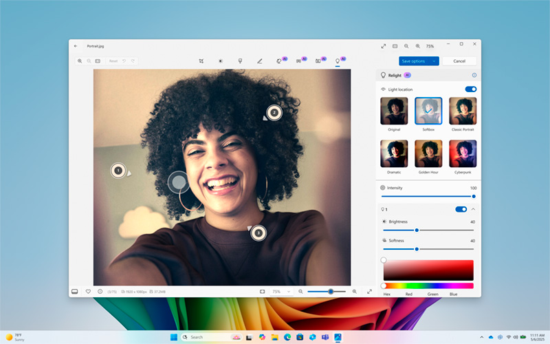 La aplicación Fotos incorpora la funcionalidad Relight, que permite modificar la iluminación de una imagen tras su captura. Se pueden posicionar hasta tres fuentes de luz virtual, ajustar su intensidad y color, y aplicar estilos predefinidos. Esta opción, disponible inicialmente en equipos con Snapdragon X Series, se orienta tanto a correcciones técnicas como a efectos creativos.