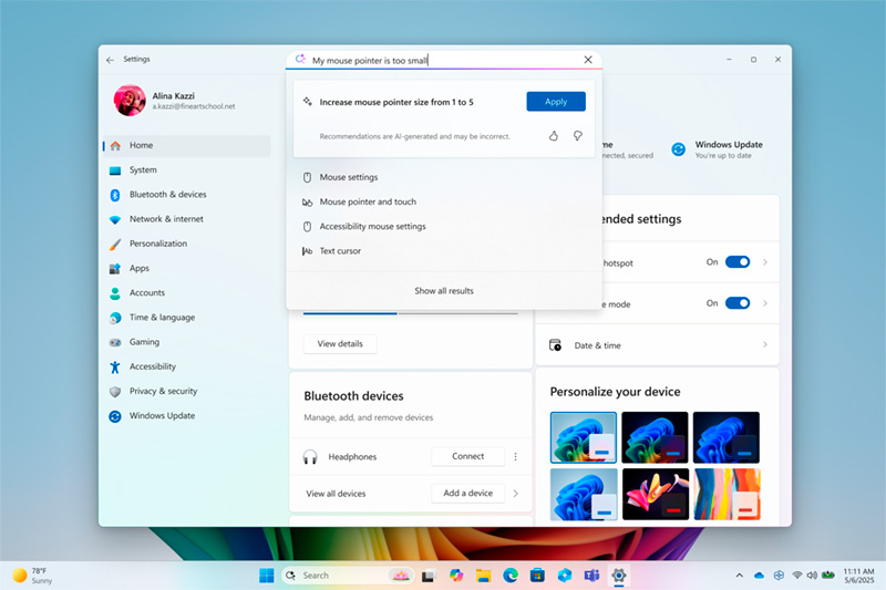 Una de las propuestas más significativas en esta actualización es la incorporación de un agente basado en IA local dentro de la aplicación Configuración de Windows. Este agente permite al usuario describir en lenguaje natural lo que necesita —por ejemplo, “quiero controlar el ordenador con la voz” o “el puntero del ratón es demasiado pequeño”— y recibir sugerencias automatizadas o ejecutar directamente los cambios necesarios, previa autorización del usuario.