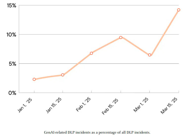 Durante el primer trimestre de 2025 se ha registrado un aumento sustancial —multiplicación por dos veces y media— en los incidentes relacionados con fuga o pérdida accidental/intencionada información sensible atribuibles al uso inadecuado o inseguro estas tecnologías emergentes. Actualmente representan ya el 14% total estos sucesos reportados.