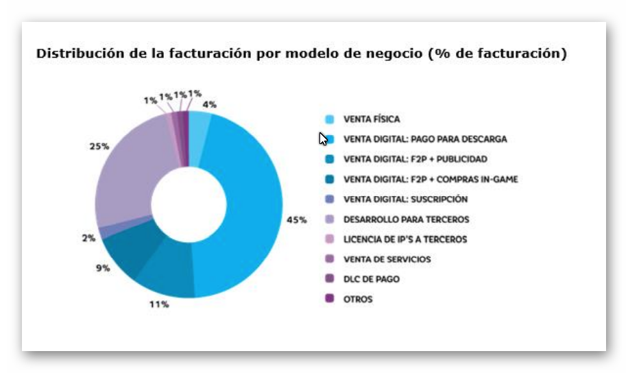Como ya sucede desde hace un tiempo, internet es el principal canal de venta; el 67% de los juegos se venden online, ya se trata de modelos gratuitos, con compras in-game, publicidad o suscripción, mientras que los videojuegos físicos suponen solo el 4% de la facturación.