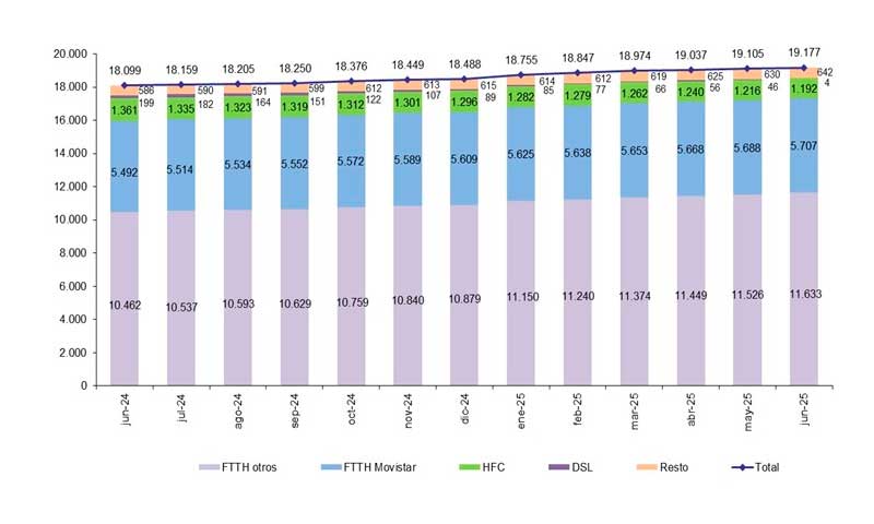 En el ámbito de la banda ancha fija, junio cerró con 19,18 millones de líneas activas, tras sumar 72.363 nuevas conexiones. La fibra hasta el hogar (FTTH) continúa siendo el motor del crecimiento con 125.853 altas netas, alcanzando un total de 17,3 millones de líneas.