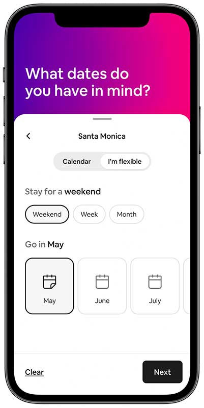 Fechas flexibles, que comenzó a implementarse en febrero, facilita la búsqueda de los mejores lugares para hospedarse si el viajero cuenta con flexibilidad a la hora de organizar el viaje. En lugar de buscar fechas fijas, ahora se puede buscar una escapada de fin de semana, unas vacaciones de una semana o incluso una estadía de un mes. Desde que se puso en marcha la herramienta, ya se han contabilizado más de 100 millones de búsquedas que han usado este criterio.