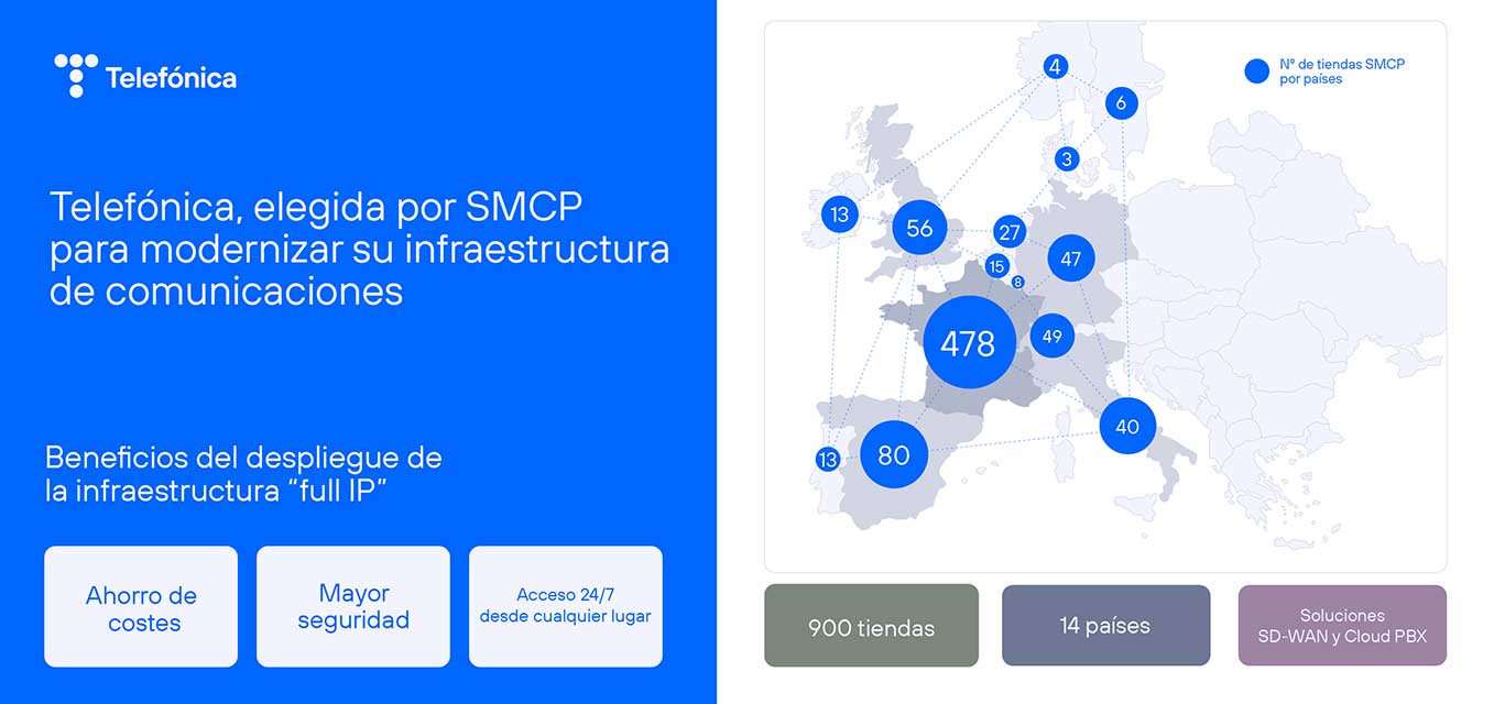 Telefónica ofrece una plataforma estable y global con una amplia cobertura de fibra en Europa para apoyar a las sedes del Grupo SMCP.