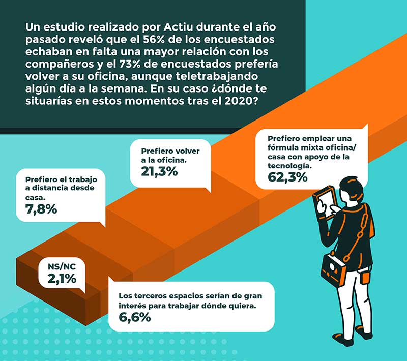 En un estudio realizado en 2020 por Actiu, líder en diseño y fabricación de espacios de trabajo y hospitality, el 56% de los encuestados echaban en falta una mayor relación con los compañeros y el 73% prefería volver a su oficina, aunque teletrabajando algún día a la semana.